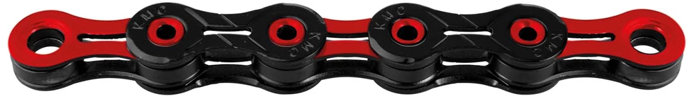 La chaîne super légère X10 DLC 10 vitesses de KMC sans dépendance au sens de marche et avec un revêtement de surface Diamond Like Coating pour les systèmes de changement de vitesse 10 vitesses.