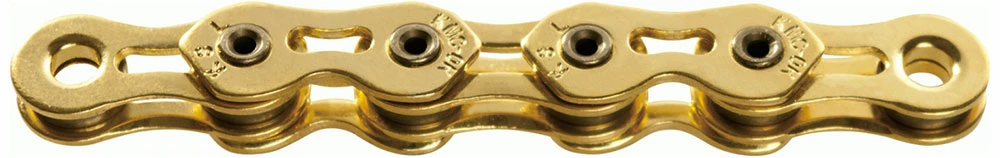 La chaîne singlespeed KMC K1SL Narrow avec surface revêtue de Titan Nitrid Gold pour BMX, système de moyeu à vitesses intégrées et autres systèmes singlespeed nécessitant une transmission directe de la puissance.