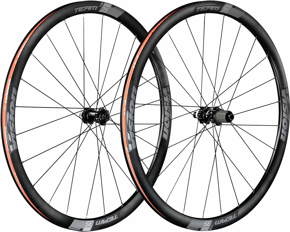 La paire de roues Team 35 Disc Centerlock en aluminium partage de nombreuses caractéristiques de performance avec les roues haut de gamme de Vision : rayonnage asymétrique 2 en 1 sur la roue arrière, roulements à cartouche étanches et roues fabriquées à la main.